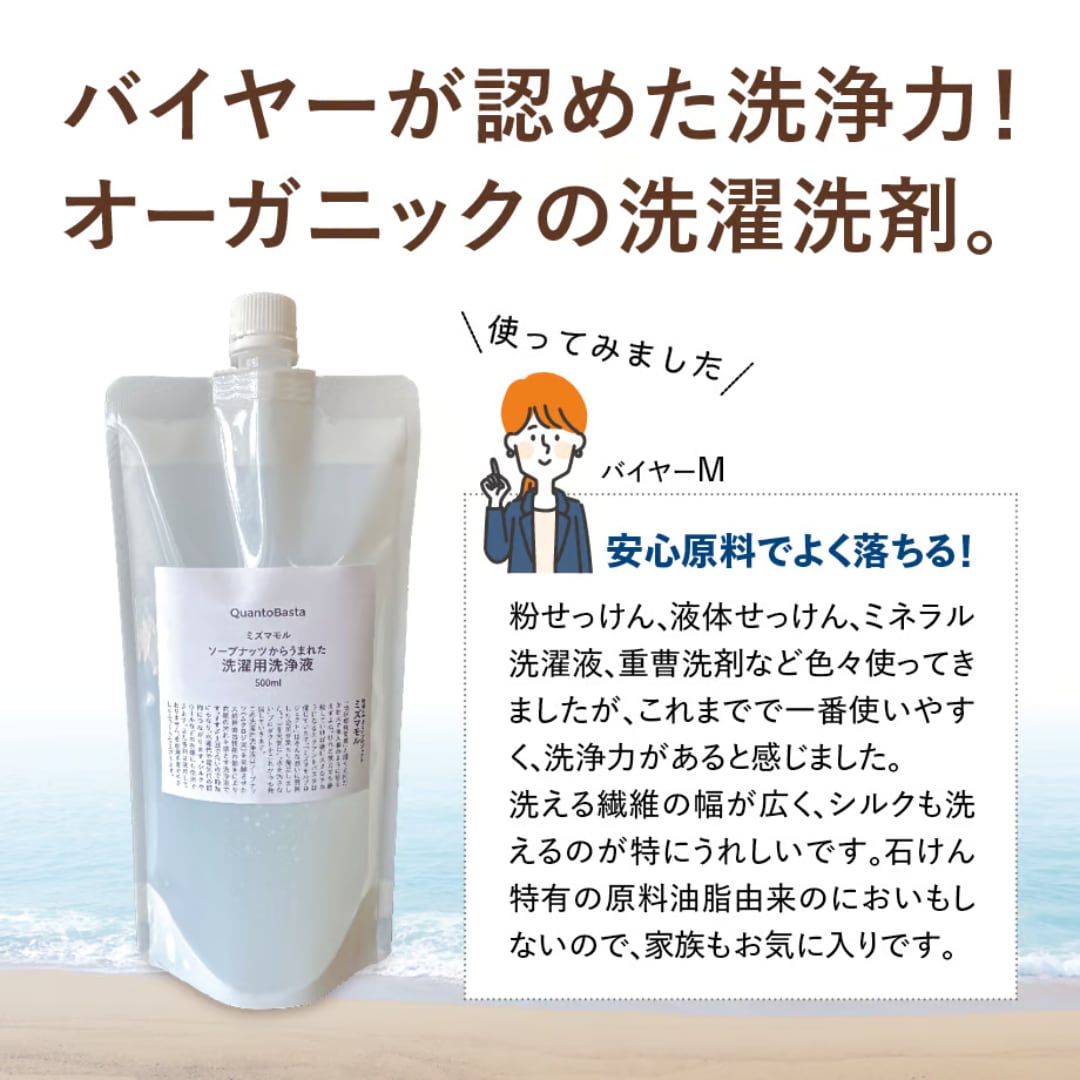 バイヤーが認めた洗浄力のオーガニック洗濯洗剤。衣類の汚れ落ちだけでなく、廃水を流した後まで考えて作りました。